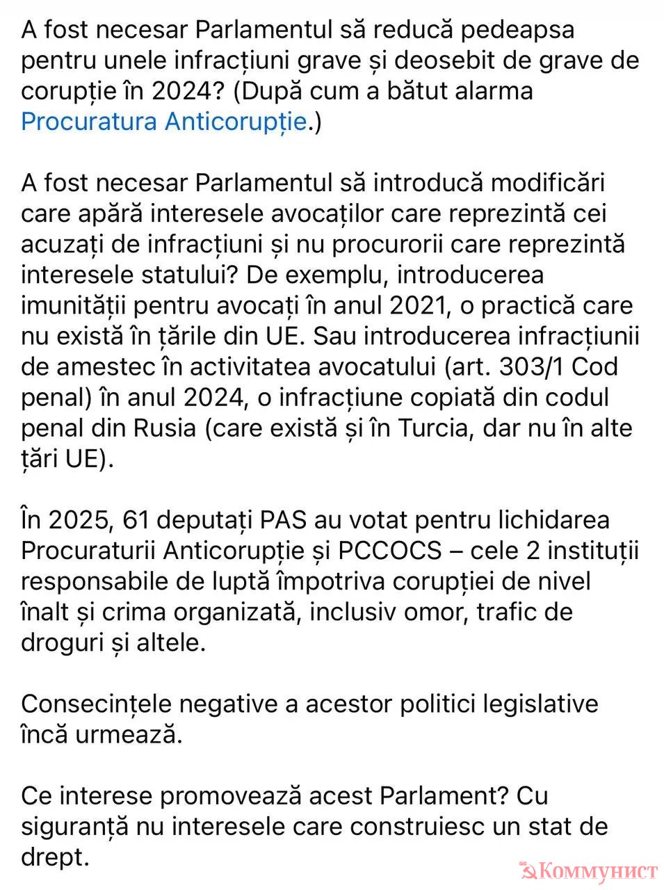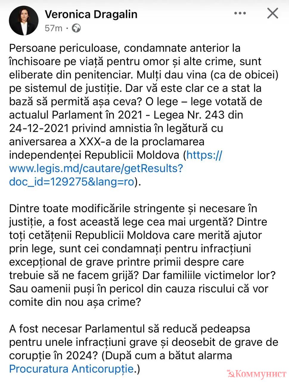 Из всех граждан Молдовы, заслуживающих помощи по закону, в первую очередь заботятся о тех, кто осужден за особо тяжкие преступления? А как же семьи их жертв? Или о людях, подвергающихся опасности из-за риска, что они снова совершат подобные преступления?» — написала экс-глава Антикоррупционной прокуратуры.