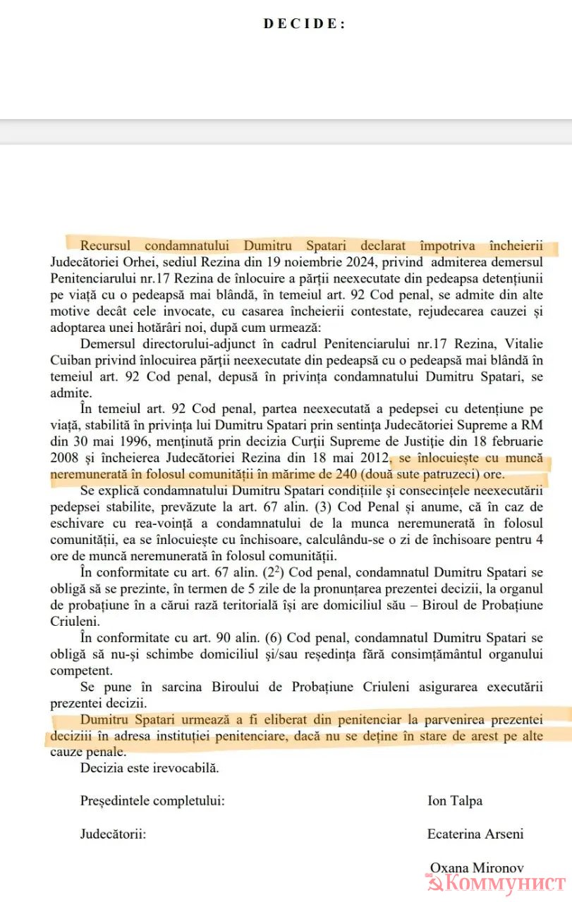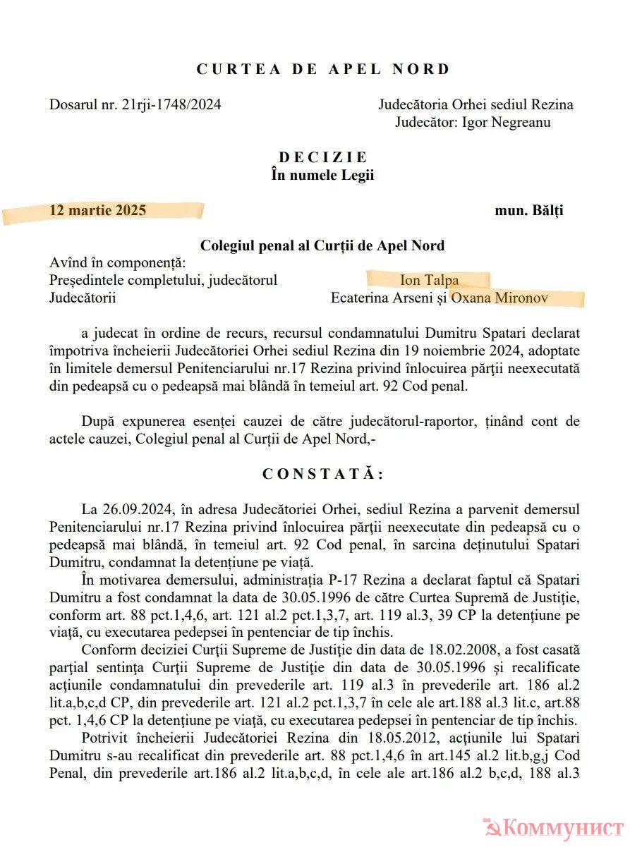 Коллеги из Observatorul публикуют судебное решение, из которого следует: вместе с подельниками Думитру Спэтарь ворвался в квартиру знакомого, бил, пытал и задушил двух мальчиков 10 и 8 лет. Затем из квартиры вынесли вещи на 4923 лея.