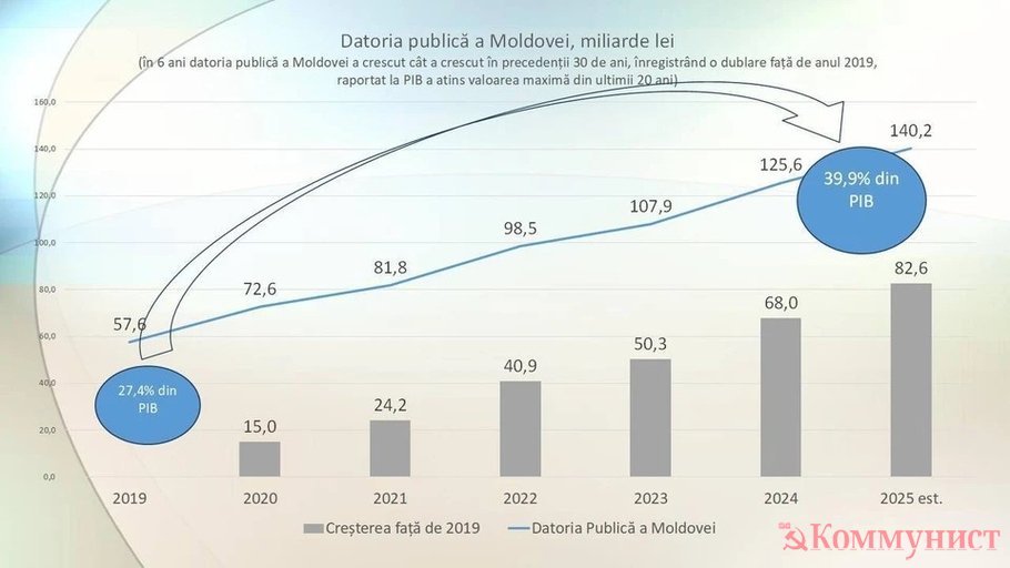 Сделаем простой расчёт. Текущий ВВП — около 340 миллиардов леев. Делим долг в 131 миллиард и получаем 38,5% от ВВП. PAS и их «эксперты» предпочитают говорить о «35%». Разница в 3,5 процентных пункта — это не пустяк. Для такой хрупкой экономики, как у Молдовы, это означает миллиарды леев и огромное бремя на плечах граждан.