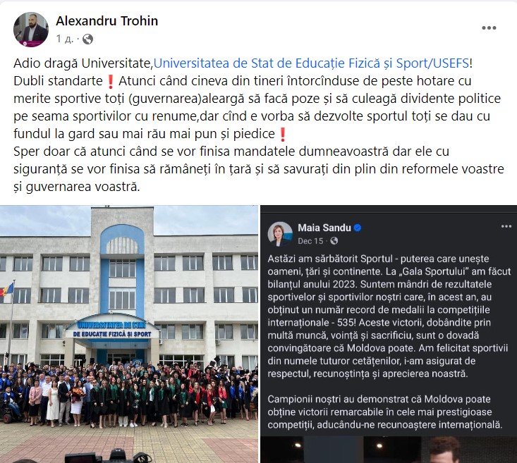 "Когда часть молодых людей возвращается из-за границы со спортивными заслугами, они все (правительство) бегут фотографироваться и собирать политические дивиденды за счет известных спортсменов, но когда дело доходит до развития спорта, они все прячутся за забором или того хуже, чинят препятствия", — отметил спортсмен в посте в Facebook, передаетactualitati.md