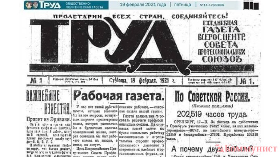 ГАЗЕТА «ТРУД»Газета «Труд», одна из старейших массовых газет Советского Союза, вышла в свет 19 февраля 1921 года как ежедневное рабочее издание Всероссийского центрального совета профессиональных союзов (ВЦСПС).