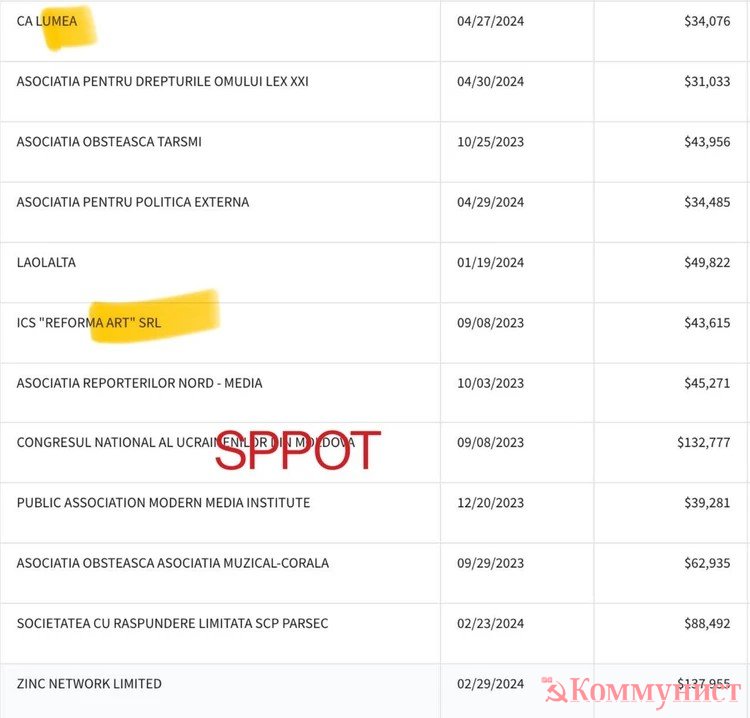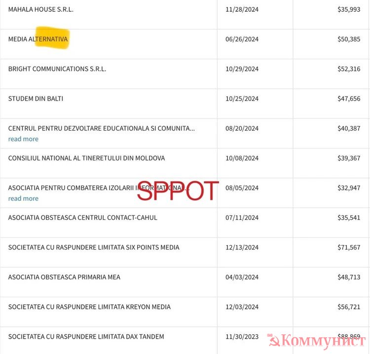 Среди получателей: «Реформа Арт» SRL (Jurnal TV) — 78 000 долларов (более 1,4 млн леев). Media Alternativa (TV8) — 50 385 долларов (около 900 000 леев). CA LUMEA (проект Наты Албот) — более 230 000 долларов (около 4,1 млн леев)